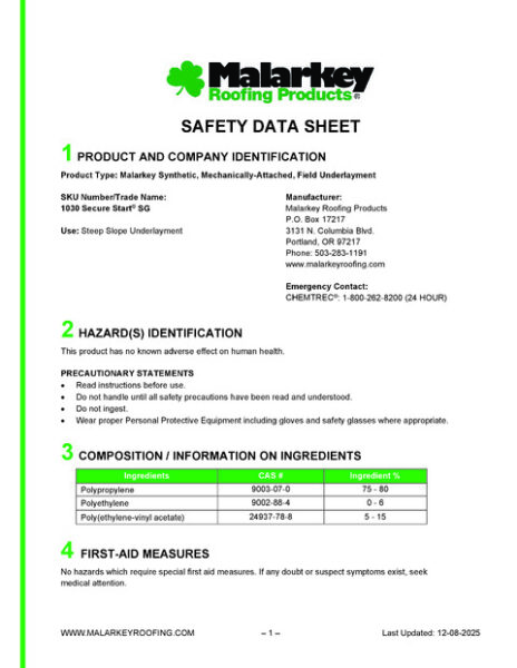 1029 Secure Start Lite, 1030 Secure Start SG, & 1031 Secure Start Plus Safety Data Sheet