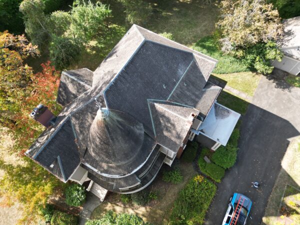 The project included a full shake tear-off, re-roof, and restoration of wooden gutters. In total, the team installed 44 squares of Malarkey Legacy® Shingles with Scotchgard™ in Black Oak from materials distributor Dealers Supply in Portland, Oregon. These shingles were selected for fire resistance and historically appropriate appearance. Additionally, HER Roofing installed vertical plywood, custom-fabricated curved wooden gutters, and returned the original copper spire to the top.