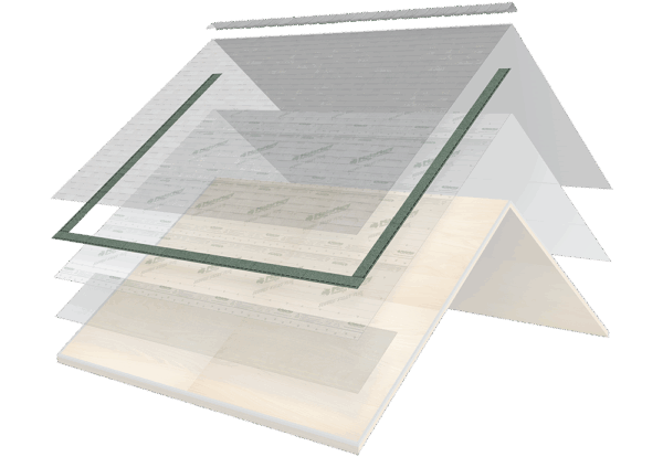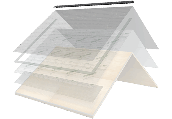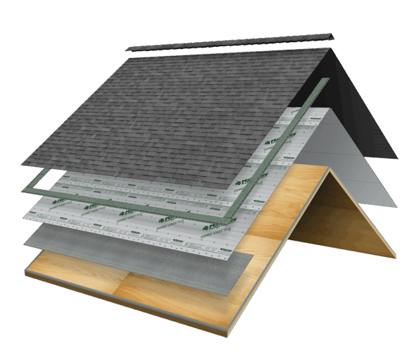 Some areas of the roof are more prone to leaks than others, like roof valleys, roof edges, and roof-to-sidewall transitions where rain, snow, and ice are more apt to accumulate. In these critical areas, Malarkey recommends an initial, extra layer of protection, called an ice and water barrier.